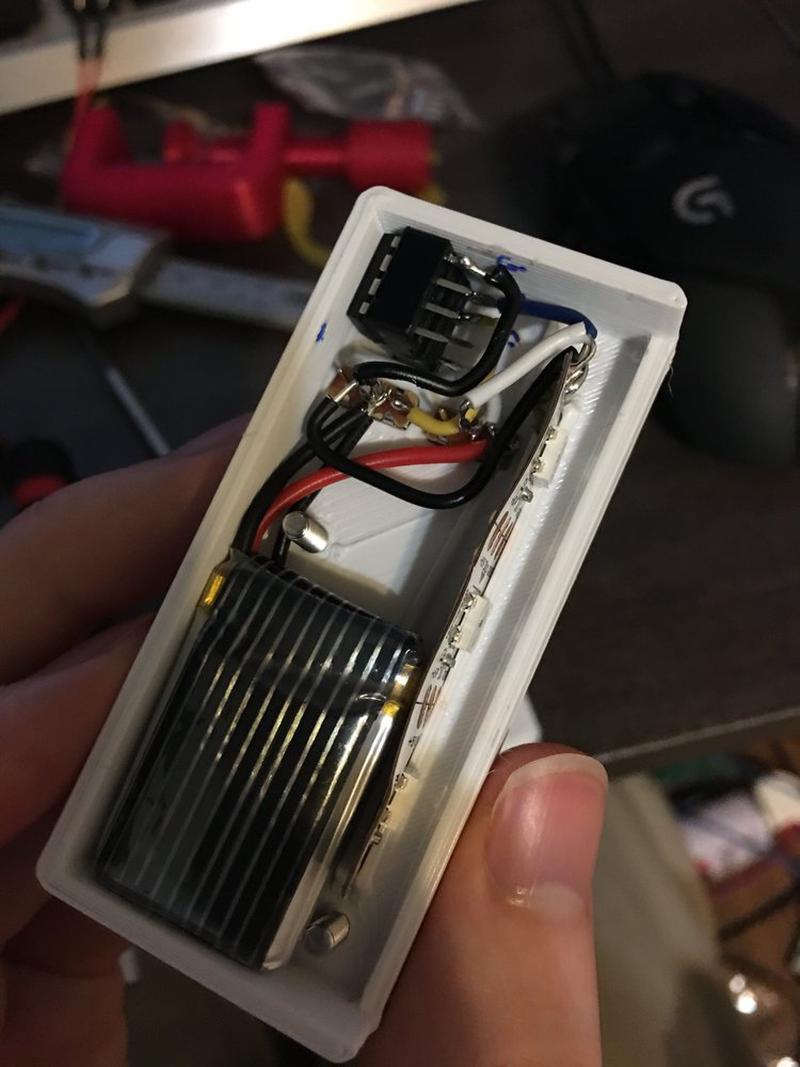 There’s a number of issues with the current revision such as poor user interface (a single switch that controls mode and brightness), a large and clearly 3D printed case, and general imperfections in the acrylic (it was cut quickly on a table saw).