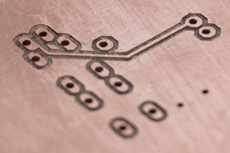 Using the same machine I engrave the acrylic with, I can engrave copper boards to create traces and drill holes. It seems to struggle with 10mil traces but the 20mil traces pictured below all look fully intact.